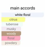 طراوت رایحه ترنج در چارچوب مفهومی عاشقانه این عطر جای میگیرد و به ظرافت لطیف رایحه رز و بهارنارنج پیوند میخورد. نتهای میانی هم این عطر را بهواسطه انبوهی از رایحههای گلهای سفید (گل مریم، گاردنیا و یاس) بسیار غنی میسازند. گرمی و خشکی چوب سدر و لطافت چوب صندل هم بهخوبی با رایحههای مشکفام در نتهای پایه آمیخته شدهاند تا عطری با ماندگاری و رد بوی جذاب داشته باشید.
