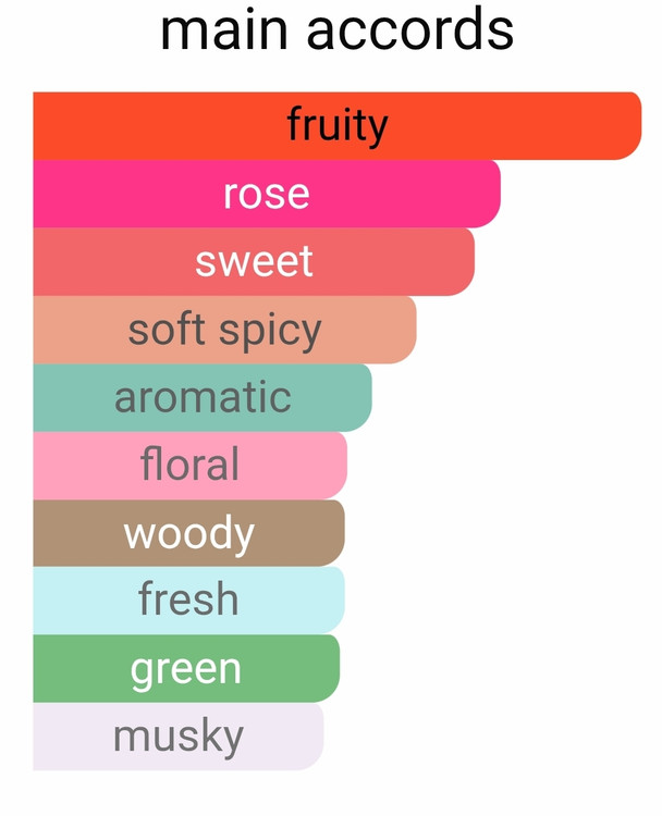این ادکلن که از رایحهای گرم برخوردار است با بوی برجستهای از دو ترکیب رز و تمشک در نت اولیه آغاز میشود. در ادامه و در نت میانی انگور فرنگی سیاه و فلفل صورتی و در پشت آنها گلهای یاس و گل صدتومانی بنفش نمایان میشوند. سپس در نت پایانی وانیل، سدر و مشک این عطر را به پایان میبرند.